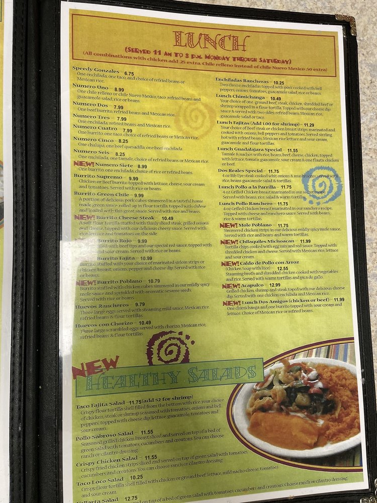 2 cheese enchiladas topped with pork cooked with bell peppers, onions, and tomatoes, guacamole salad and your choice of rice or beans.